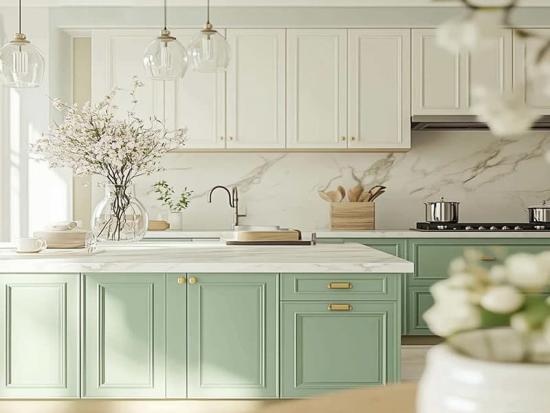 Ceci est un meuble de cuisine de style européen couleur crème L'ensemble comprend un meuble haut blanc et un meuble bas vert clair aux poignées dorées, créant ainsi une ambiance rafraîchissante et naturelle dans toute la cuisine.