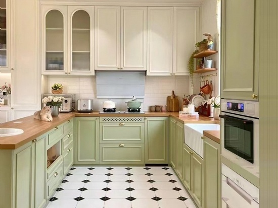 Voici un meuble de cuisine français avec des portes crème et vert clair et des poignées dorées. L'ensemble dégage une impression de fraîcheur et de bien-être. La porte du meuble, de style Shaker, est classique et intemporelle, à découvrir absolument.
