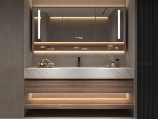 C'est un meuble de salle de bain moderne Fabriqué en placage de bois avec un élégant miroir, il est doté de cloisons et de tiroirs offrant un grand espace de rangement. Il est équipé de bandes LED, à la fois esthétiques et pratiques.